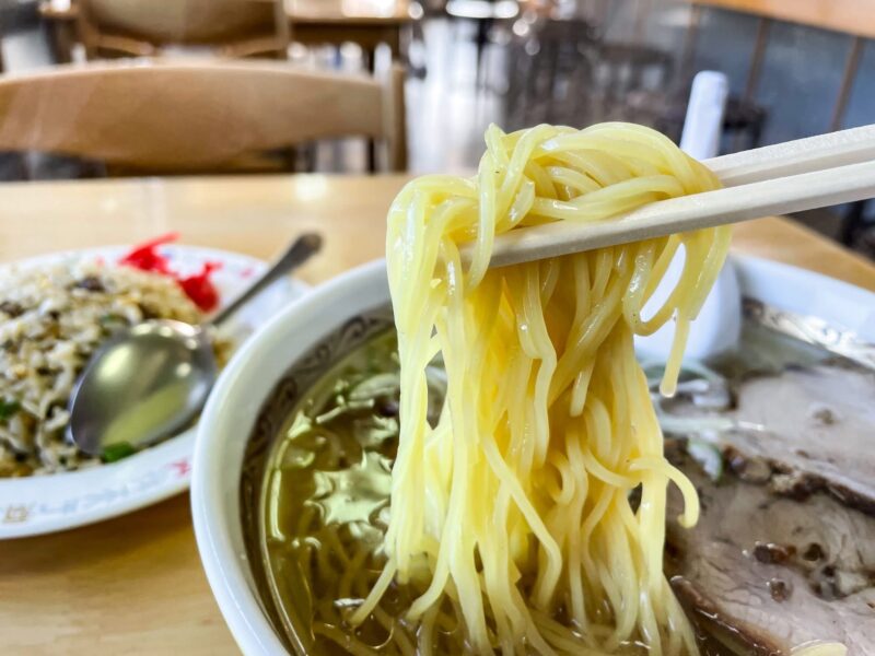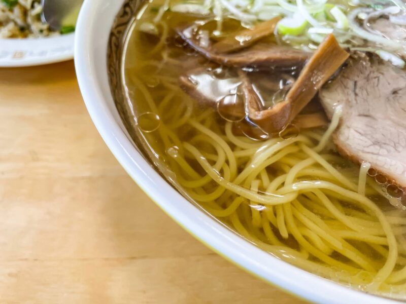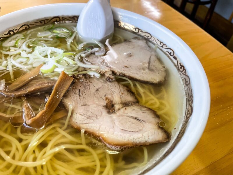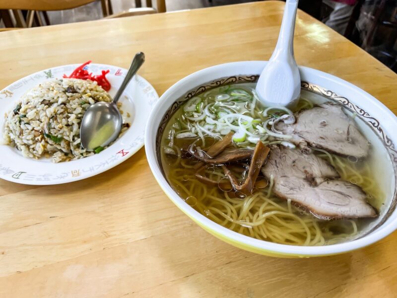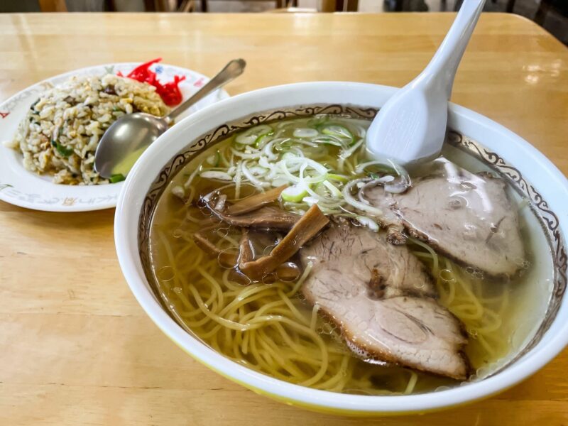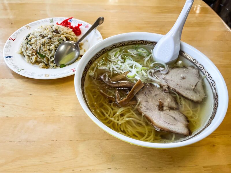 この日は、こちらでランチタイム!ラーメン屋さん巡り、今回は湯川にある昭和23年創業(1948年)老舗ラーメン屋さんのこちら!早速注文したのは、チャーハンセット(塩ラーメン)