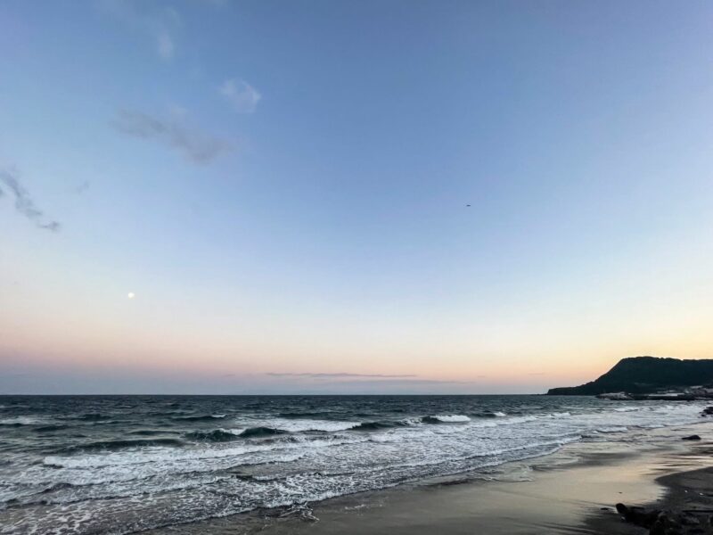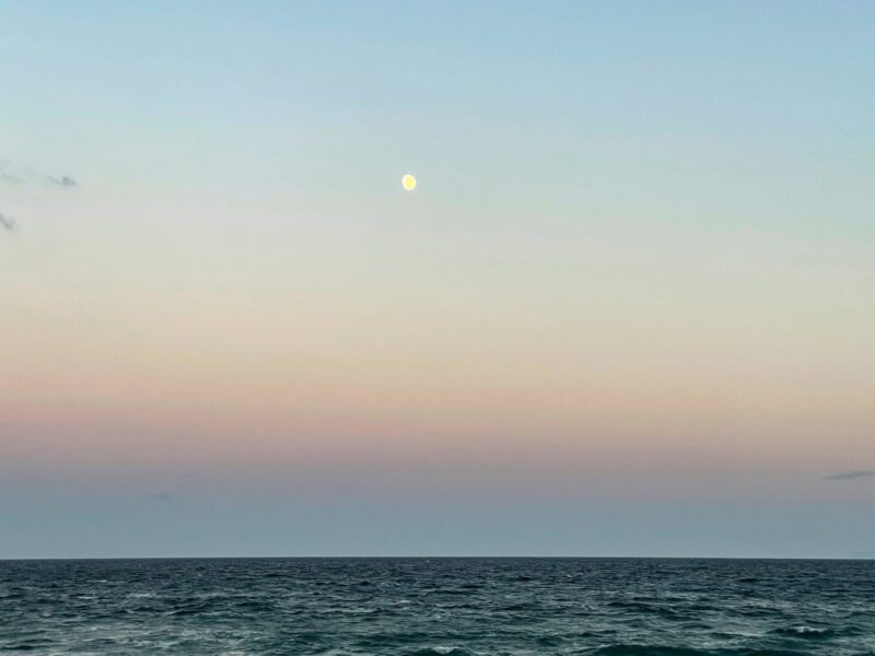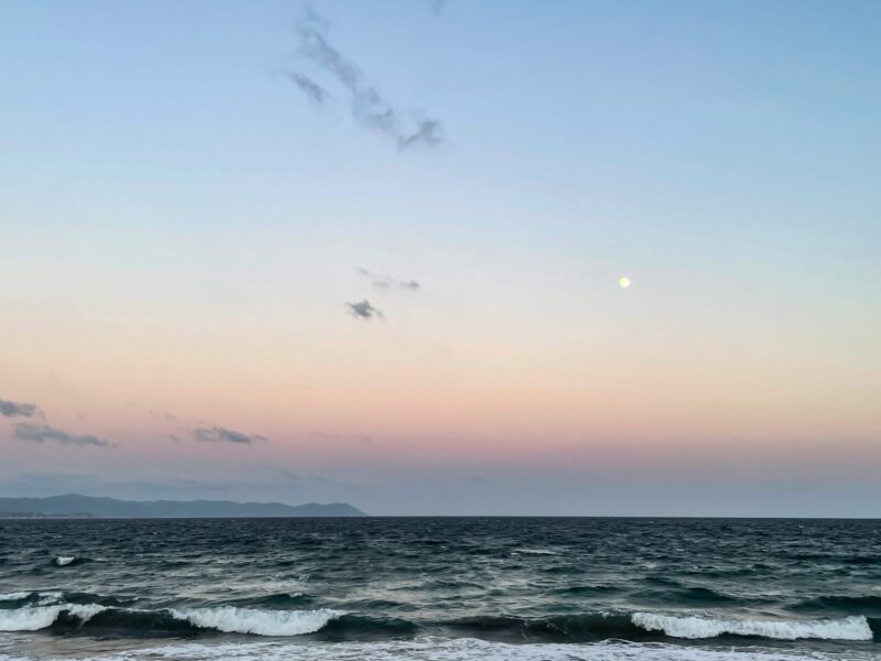 いつものカフェラミネールからの帰り道、ふと海を観たら良い感じの月。車を止めて、立ち止まってみた。心地好い潮風も、もう少ししたら厳しさに変わって行く。