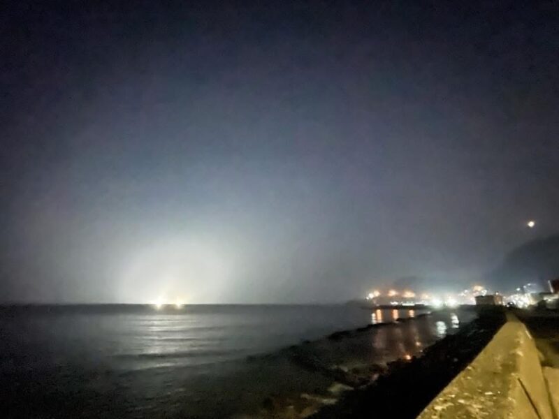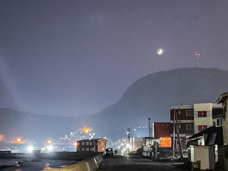 いつものカフェラミネールからの帰り道、漁火が見えたので車を止めてパチリ。イカ獲れてるかなぁと思いながら、ふと函館山を見るとお月さんを見つけパチリ。この日も穏やかな良い一日でした。